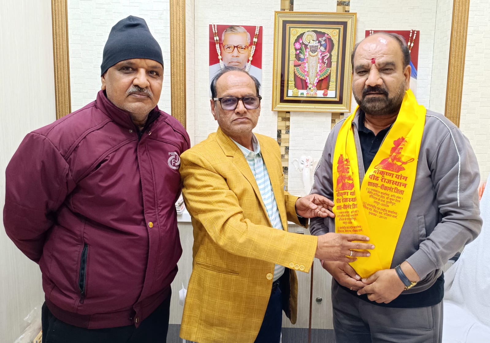 सलाहकार नियुक्त होने पर समाज सेवी और सोशल एक्टिविस्ट डॉ. नरेश गोयल का श्रीकृष्ण योग पीठ बीकानेर शाखा के संयोजक दीवान सिंह यादव ; संभाग प्रभारी सुशील यादव ; सचिव दिलीप गुप्ता द्वारा दुपट्टा पहना कर स्वागत सम्मान किया गया।
