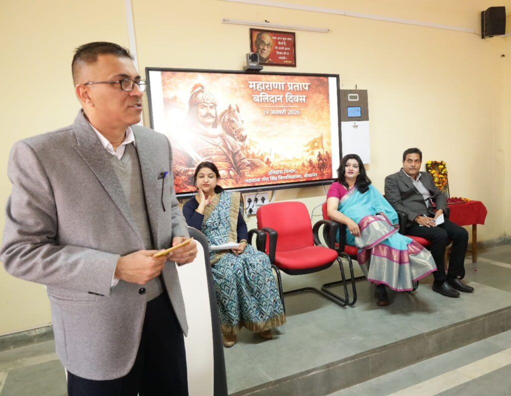 बीकानेर 19 जनवरी । महाराजा गंगा सिंह विश्वविद्यालय के इतिहास विभाग द्वारा महाराणा प्रताप बलिदान दिवस मनाया गया जिसमें बोलते हुए मुख्य वक्ता प्रबंधन गुरु इंजीनियरिंग कॉलेज के डॉ. गौरव बिस्सा ने कहा कि प्रताप के जीवन से आज भी विद्यार्थी जीवन प्रबंधन के गुर सीख सकते हैं। मूल्यों को जीवित रखते हुए सम्मानजनक शांति, सामान्य वर्ग के साथ समन्वय व महिलाओं के प्रति सम्मान का उल्लेखनीय उदाहरण महाराणा प्रताप रहे। अपने उद्बोधन में डॉ. बिस्सा ने आज के शिक्षार्थियों के इतिहासबोध की कमी पर भी चिंता व्यक्त करते हुए युवाओं से प्रताप जैसे शूरवीरों की जीवनियां पढ़ने का आह्वान किया।