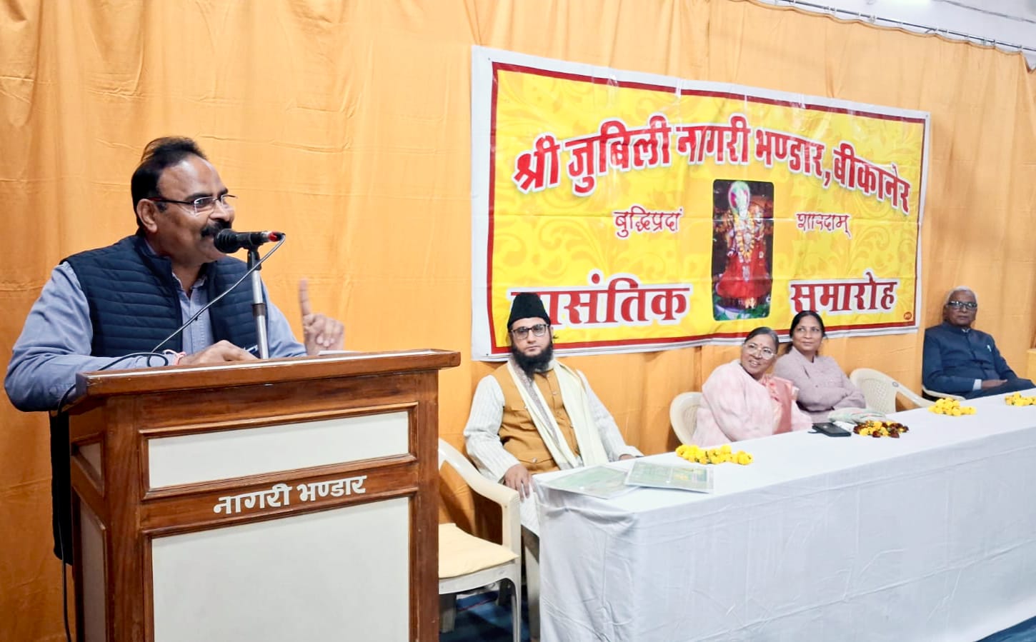 बीकानेर, 22 जनवरी। श्री जुबली नागरी भंडार के 119वें स्थापना दिवस तथा बसंत पंचमी के अवसर पर सांस्कृतिक और साहित्यिक कार्यक्रमों के आयोजन की शृंखला के तहत नागरी भंडार परिसर में कवि सम्मेलन और मुशायरे का आयोजन किया गया। कार्यक्रम के आरंभ में व्यवस्थापक नन्दकिशोर सोलंकी ने इस गौरवशाली परिसर की महत्ता पर प्रकाश डालते हुए स्वागत उद्बोधन दिया। कार्यक्रम की अध्यक्षता ट्रस्टी डॉ दिनेश शर्मा ने की। अतिथि के रूप में शायर वसितुल्लाह इमदाद बासित, कवयित्री डॉ कृष्णा आचार्य, जनसंपर्क विभाग के उपनिदेशक हरिशंकर आचार्य व कवयित्री इंजी.आशा शर्मा उपस्थित रहे। अतिथियों ने अपनी रचनाओ की प्रस्तुति दी।