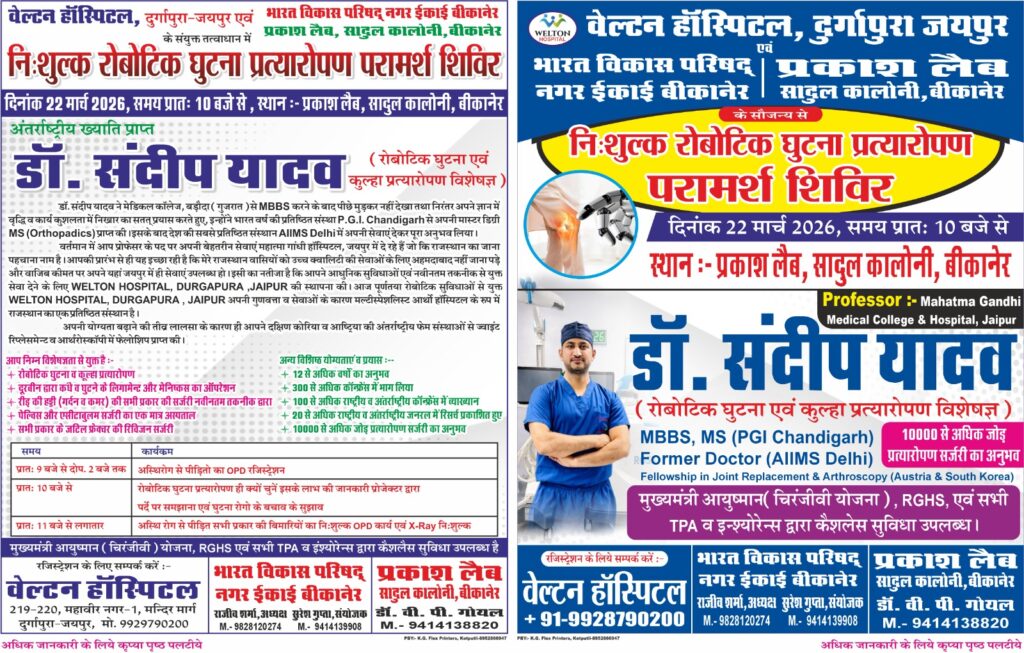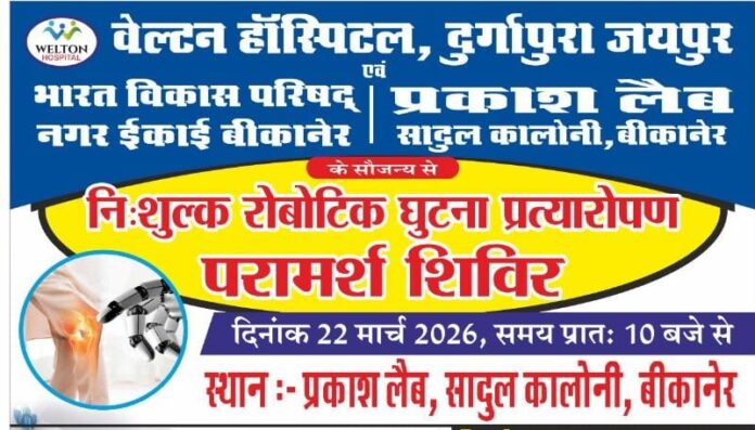 बीकानेर, 22 मार्च। सामाजिक सरोकारों के अंतर्गत स्वास्थ्य सेवाओं को जन-जन तक पहुंचाने के उद्देश्य से भारत विकास परिषद, नगर इकाई, बीकानेर द्वारा एक महत्वपूर्ण पहल की जा रही है। परिषद द्वारा वेल्टन हॉस्पिटल, दुर्गापुरा (जयपुर) एवं प्रकाश लेब, सादुल कॉलोनी (बीकानेर) के संयुक्त तत्वावधान में दिनांक 22 मार्च (रविवार) को निशुल्क रोबोटिक घुटना प्रत्यारोपण परामर्श शिविर का आयोजन किया जाएगा।