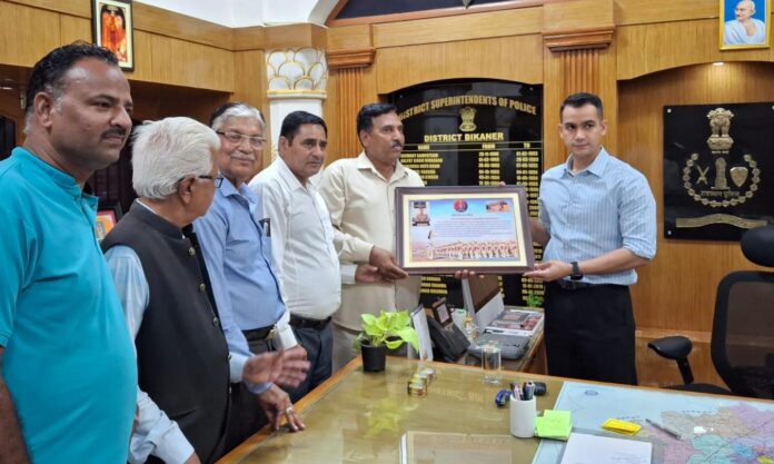 बीकानेर, 16अप्रेल। आज राजस्थान पुलिस स्थापना दिवस और बीकानेर स्थापना के उपलक्ष में पुलिस अधीक्षक मृदुल कच्छावा को समाधान संस्थान के संभाग अध्यक्ष डॉ.मिर्जा हैदर बेग पूर्व महापौर व न्यास अध्यक्ष हाजी मकसूद अहमद एड.ओम प्रकाश छंगाणी महेन्द्र कुमार जैन मोहम्मद सोयब साजिद पीएच सोहेल खान लोदी ने बीकानेर गौरव का स्मृति चिञ्ह भेंट किया। डॉ.बेग ने बताया कि इस स्मृति चिञ्ह में उल्लेखित किया गया कि आदरणीय मृदुल कच्छावा पुलिस अधीक्षक बीकानेर हमें आप पर गर्व है कि आप राजस्थान के सुनहरे धोरों की धरती गंगा जमुनी संस्कृति के परिचायक शहर बीकानेर के निवासी हैं इसीलिए आपकी कार्यशैली में कर्त्तव्यनिष्ठा , निडरता व साहसपूर्वक लिए गए निर्णय ही प्रदेश को सुरक्षित और सशक्त बनाते है। आप बाखूबी विपरीत परिस्थितियों में भी अपने कर्तव्यों का निर्वहन करते हैं जिससे समस्त पुलिस कर्मचारियों को प्रेरणा मिलती है वह बुलंद हौसले से आपके मार्गदर्शन में मिशन को अंजाम देते हैं।
