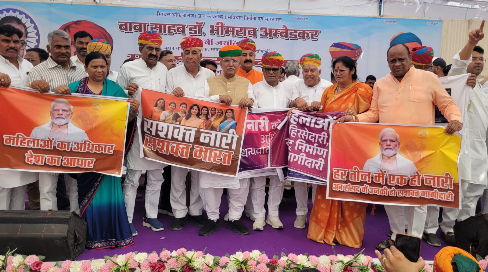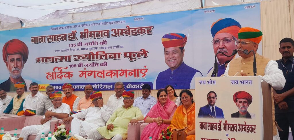 केन्द्रीय मंत्री मेघवाल ने सोमवार को राजकीय पाॅलिटेक्निक काॅलेज मैदान में भारत रत्न बाबा साहेब डाॅ. भीमराव अम्बेडकर की 135वीं तथा महात्मा ज्येतिबा फूले की 199वीं जयंती के अवसर पर भावना मेघवाल मेमोरियल ट्रस्ट की ओर से आयोजित विशाल जनसभा को संबोधित कर रहे थे।