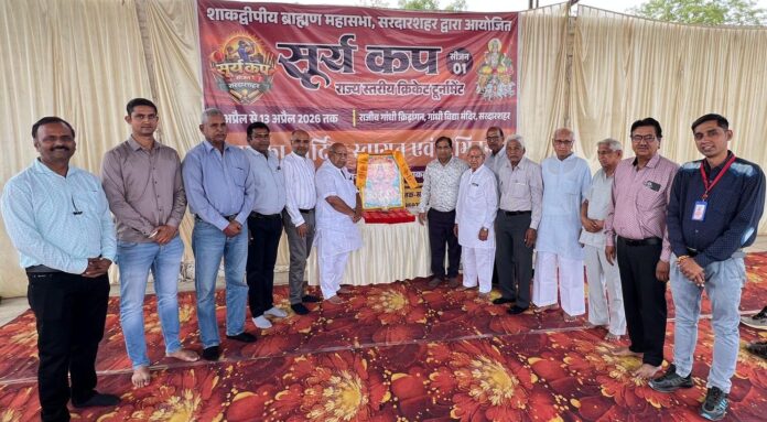 बीकानेर 11 अप्रैल । शाकद्वीपीय ब्राह्मण महासभा सरदारशहर राज्य स्तरीय सूर्य कप सीजन वन क्रिकेट प्रतियोगिता राजीव गांधी क्रीड़ांगन में भगवान सूर्य की साक्ष्य शुरू हुई । प्रतियोगिता का शुभारंभ राजस्थान प्रांतीय शाकद्वीपीय ब्राह्मण महासभा के अध्यक्ष गणेश दास सेवग बीकानेर द्वारा किया गया।